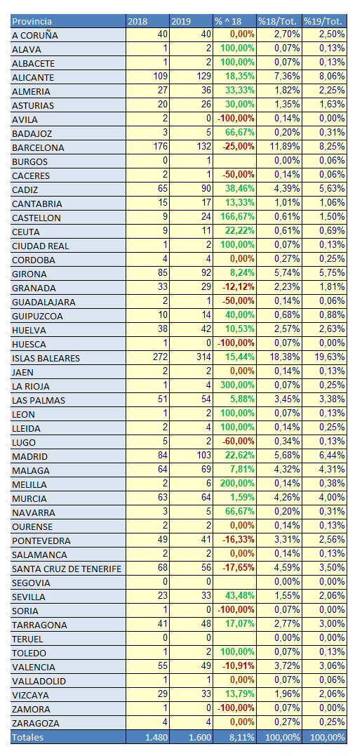El mercado náutico ha registrado 1.600 matriculaciones de embarcaciones hasta abril de 2019, lo que representa un crecimiento del 8,11% con respecto al mismo período de 2018.