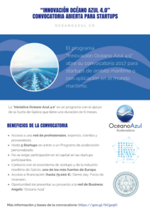 Programa “Innovación Océano Azul 4.0” 2017 de apoyo a startups de la industria 4.0 de ámbito marítimo Hasta el próximo 30 de abril todas aquellas startups de la industria 4.0 que desarrollen modelos de negocio en áreas tecnológicas de ámbito marítimo o con potencial aplicación en el mundo marítimo, pueden inscribirse en el programa de ayuda “Innovación Océano Azul 4.0”, creado por el Colegio Oficial de Ingenieros Navales y Oceánicos (COIN) y que cuenta con el apoyo de la Xunta de Galicia. |
