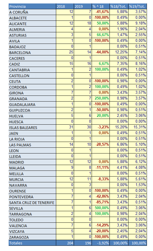 En total, en enero de 2019 se han matriculado en España 196 embarcaciones de recreo, frente a las 204 registradas en el mismo mes de 2018. De estas, tan sólo 13 han corresponden a embarcaciones destinadas exclusivamente a uso comercial de alquiler (chárter náutico).
