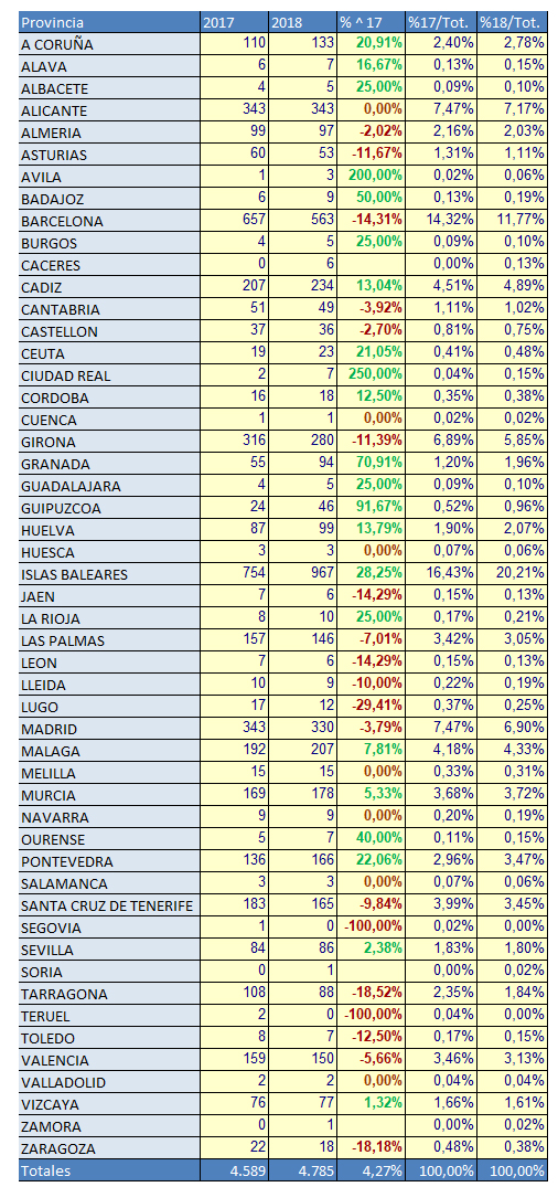 El mercado náutico ha registrado 4.785 matriculaciones de embarcaciones de recreo desde enero hasta agosto de 2018, lo que supone un crecimiento del 4,3% con respecto al mismo período del año pasado.