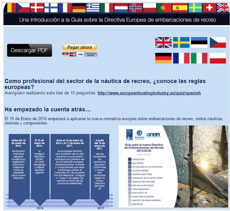 Como ANEN publicó en su día (ver noticia pinchando aquí), para la correcta interpretación de la nueva Directiva 2013/53/UE, EBI (European Boating Industry) e ICOMIA (International Council of Marine Industry Associations) con la colaboración de ANEN, entre otras asociaciones de la náutica europeas, elaboraron la Guía para la interpretación y cumplimiento de los requisitos de la nueva Directiva que se puede descargar en el siguiente enlace: http://www.europeanboatingindustry.eu/appsite/