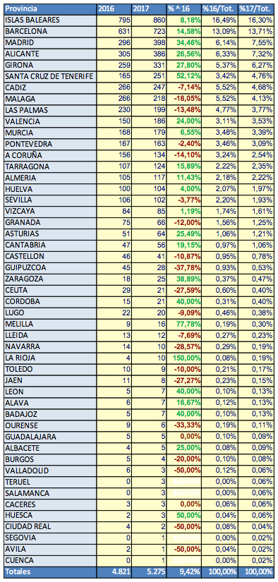 Matriculaciones de embarcaciones de recreo por provincias 2017